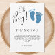 This cute boy's baby shower thank you card features the text "Oh Boy!" in stylish script typography with blue glitter baby feet.
