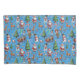 Christmas-themed pattern featuring Santa Claus, reindeer, snowmen, elves, Christmas trees, candy canes, and snowflakes on a blue background
