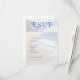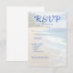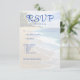 Blue and white beach wedding RSVP card with ocean and palm trees. Personalise it with your event details. Great for a summer wedding.