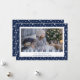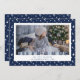 Custom blue believe in the magic photo Christmas cards featuring a decorative title and a magical background with gold snow and white stars on a plain blue backdrop. Easily personalise these blue photo Christmas cards with your image and a family name.