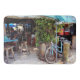 On this large Bath Mat - Casual, relaxed, riding around on bicycles, these are some of the things that make up the comfortable lifestyle pictured in this original photograph by ZoeSPEAK, of an aqua blue bicycle leaning against a post in front of an open air bar in Key West, Florida. There is a leafy green bush in a tub, under an awning which matches the colour of the bike. The dark interior of the place is filled with wooden bar stools, and aqua and cobalt blue umbrellas over the tables. An aqua blue bar in front completes the colourful photo.