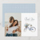This bohemian inspired photo thank you card features a blue bicycle carrying a basket filled with beautiful blue and white flowers and a pair of lovebirds on the seat. Sweet, simple and elegant. Easily personalise this design with your photo and information and complete the look with with the stationery and accessory options with this theme. Especially nice for spring and summer weddings. Based on an original watercolor by © Lisa Audit Art. Surround yourself with heartwarming art.