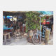 Casual, relaxed, riding around on bicycles, these are some of the things that make up the comfortable lifestyle pictured in this original photograph of an aqua blue bicycle leaning against a post in front of an open air bar in Key West, Florida. There is a leafy green bush in a tub, under an awning which matches the colour of the bike. The dark interior of the place is filled with wooden bar stools, and aqua and cobalt blue umbrellas over the tables. An aqua blue bar in front completes the colourful photo.