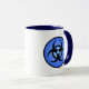 Black biohazard symbol on a blue circular background. Makes a profound statement about the office coffee. Choice of ceramic, glass or stainless steel travel mug.