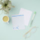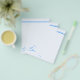 Customised bird stationery that features a blue bird standing on a tree limb in the bottom left corner and a blue stripes across the top. Mix and match our stationery pages to make great gifts for girls who like to write special messages to friends and family.
