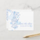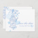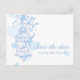 Cute bird couple in graphic drawing of open bird cage hanging from a blossoming spring tree with hearts. Fashionable modern chic wedding design part of the blue bird cage romantic wedding stationary set. Edit this save the date wedding postcard with your names, dates and own wording. Unique drawing and design by Sarah Trett.