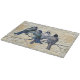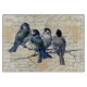 Beautiful little blue birds on a tree branch are set on a great music collage of vintage sheet music in cream and tan, to make a lovely glass cutting board or grazing board.