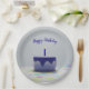 A blue cartoon birthday cake with sprinkle-covered frosting running down the sides and a lit candle sits on a golden plate on a counter covered in colourful dots.