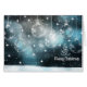 Merry Christmas greeting card featuring white ornaments and sparkling stars on dark blue background with bokeh effect; customizable text message inside.