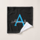 Black and Blue Simple Script Monogram Name Bath Towel. This makes the perfect sweet 16 birthday, wedding, bridal shower, anniversary, baby shower or bachelorette party gift for someone that loves glam luxury and chic styles.