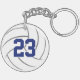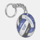This custom team colours volleyball keychain features the realistic image of a volleyball that has a floral kaleidoscopic pattern blended with its blue and black panels - her name, court position, team name and school / club year are customisable on the front, as is her jersey number on the back overlying a simple volleyball seams graphic - by katz_d_zynes