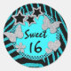 This chic and trendy customisable 1.5" round Sweet 16 birthday sticker has an aqua blue faux glitter (PRINTED) and black zebra print animal stripes with a polka dots pattern and silver faux glitter (PRINTED) butterflies, stars, hearts, and a funky flower, with text boxes to customise how you want on it that will appeal to a modern, young girl. You can select from 2 sizes. Everything will print as you see it on your monitor, so if you need help customising your text, or if you would like a matching sweet sixteen, Bat Mitzvaj, or Quinceanera party invitation, or if you want it in another colour combination, please email niteowlstudio@gmail.com BEFORE you order.