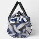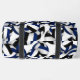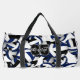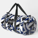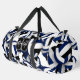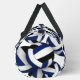 This cool volleyball player's duffle bag features a random pattern of varied size blue, black & white volleyballs turned every which way on a white background - customise with the athlete's name & jersey number - by katz_d_zynes