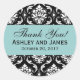 Elegant black and white damask wedding favour stickers with names and wedding date and a light blue accent colour. Layout by Elke Clarke©. Graphics licensed. For other colours of damask please contact luxuryweddinginvitations@gmail.com
