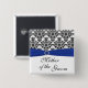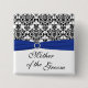 This black and white damask with a PRINTED royal blue ribbon and jewel buckle Mother of the Groom button matches the wedding invitation shown below. The text is customisable and so is the shape and size of the button. ****PLEASE note that if you change the shape to the round button that text may get cut off. It will print as it appears on your monitor, and you must allow addequate space around the edges. If you need anything changed, please email niteowlstudio@gmail.com.