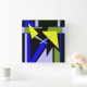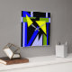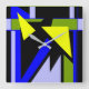 Featured is an abstract, contemporary design in bold geometric shapes of bright and light blue black yellow, and olive green.