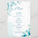 This wedding menu card exudes a soft, calming elegance with its cool blue floral design. The watercolor-style flowers flow gracefully along the upper left and lower right corners, giving the card a delicate, airy feel. The background is a subtle wash of pale blue tones, reminiscent of a watercolor sky, which enhances the card’s gentle aesthetic. The script font used for the names is both elegant and modern, while the additional text is presented in a clean serif font, ensuring readability while maintaining sophistication. Ideal for a spring or beach wedding, this invitation creates a serene and inviting first impression for your special day.