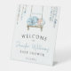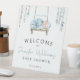 Blue elegant watercolor baby boy sleeping on the swing with floral boho baby boy shower welcome sign.