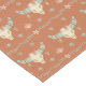 On this unique table runner is a tribal motif that features cow skulls with pale blue horns and decorated with feathers and boho style flowers. Along with the skulls are tribal designs in the pattern, and everything is placed on a medium cinnamon brown background. This pattern fits well into a western or Native American decor scheme.