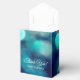 Turquoise blue bokeh light photo effect custom wedding Favour Box with personalised text for thanking guests. Custom thank you message from bride and groom. Abstract party image white ribbon bow knot. Customisable background.