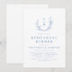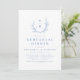 Blue and white minimalist rehearsal dinner invitation, with your monogrammed initials framed by elegant crest and hand illustrated botanical leaves on the top. Your event details are shown below in modern script and classic font. Simple and luxury.