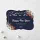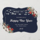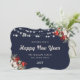 Elegant blue New Year card featuring a watercolor painting of poinsettia, holly and red berries along with string lights. Easily personalize online.
