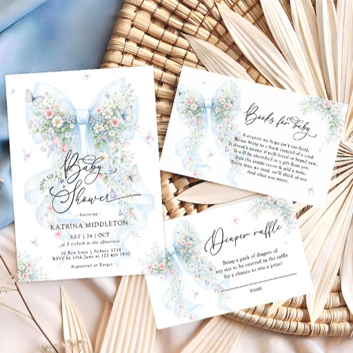 Celebrate a beautiful Baby Shower with this elegant invitation. This romantic design features a soft blue, airy bow adorned with delicate wildflowers and graceful butterflies, creating a dreamy and timeless look perfect for welcoming a little one. The flowing sheer ribbon, pastel florals, and gentle butterfly accents bring a light, whimsical feel, while the clean layout keeps the design refined and sophisticated. Ideal for a garden-themed, floral, or classic Baby Shower celebration. Matching items are available.