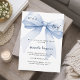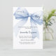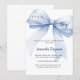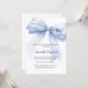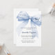 An elegant white background, decorated with a large blue bow. Personalise and add a name and party details.