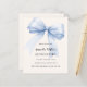 A soft beige, cream coloured background, decorated with a large blue bow. Personalise and add a name and party details.