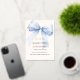 A soft beige, cream coloured background, decorated with a large blue bow. Personalise and add a name and party details. The name and event are written with real silver foil