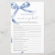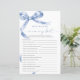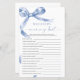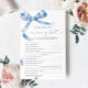 Blue Bow "Who Knows Mummy Best" Game – Add some fun to your baby shower with this charming game card featuring a delicate blue bow design. This "Who Knows Mummy Best" game is perfect for engaging guests and celebrating the mummy-to-be in style. With elegant script and feminine accents, this game card is a beautiful addition to any baby shower theme, making it a memorable keepsake for the mum and her loved ones.
