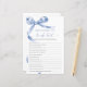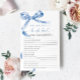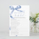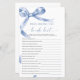 Blue Bow "Who Knows The Bride Best" Game – Add some fun to your bridal shower with this charming game card featuring a delicate blue bow design. This "Who Knows The Bride Best" game is perfect for engaging guests and celebrating the bride-to-be in style. With elegant script and feminine accents, this game card is a beautiful addition to any bridal shower theme, making it a memorable keepsake for the bride and her loved ones.