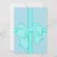 Blue baby shower invitations. On the front is a blue background colour with a pattern of tiny polka dots and a light blue ribbon crossed over in the middle. Over the background is a white rectangle space to add all your details. All text is in light and dark blue lettering. At the top of the rectangle is a washing line with blue baby clothes pegged to it. On the back is a blue background with tiny polka dots and a crossed over blue ribbon with a big blue bow in the centre.