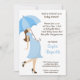 An easy to customise, chic and mod style baby shower invitation for the expectant mum-to-be. This cute baby shower invitation features an adorable graphic showing a hip and fashionable pregant woman with a large baby bump by JWI Designs. She's wearing a pretty polkadot dress and holding a blue striped umbrella which rests on her protruding belly,obviously in the later stages of pregnancy and due to give birth soon! Coordinating stylish font in matching blue and brown.