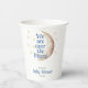 Blue Boy Baby Shower Paper cups with cute and common phrase 'we are over the moon'.
