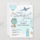 Onederful World Travel boy's 1st first Birthday features aeroplane, passport, hot air balloon, blue luggage, globe, camera and script heart calligraphy type.