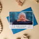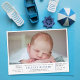 Photo post birth baby shower invitation in a clean blue and white design with focus on a photo of your newborn baby.