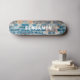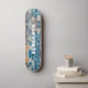 Unique skateboard has a rustic blue brick wall background, with some bricks painted white and rust. You personalize it with your name using the easy to use template. It's funky and colorful and would look great hanging on the wall in your room. Or, order it with the trucks and wheels and get on it and ride!