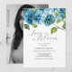Enhance your bridal shower with our floral invitations, featuring a border of hand-painted watercolor hydrangeas in shades of blue. The trendy script typography "Love is in Bloom" adds a touch of modern elegance, while your event details are displayed in a chic sans serif and hand-lettered script type. The reverse side of the card features a photo of the bride to be. Perfect for garden-themed luncheons or brunch and bubbly bridal showers. Explore the matching theme by Victoria Grigaliunas at https://www.zazzle.com/collections/blue_petals_and_prosecco_bridal_shower-119317453494662805