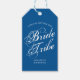 Bridesmaid Proposal Gift Tag Cards. This asking bridesmaid card features the words "Bride Tribe" in a white calligraphy font over a trendy blue background. You can change the words to personalise your favour tag to whatever you like. These gift tags pair beautifully with my nautical anchor wedding stationery. To see more, visit www.zazzle.com/vginvites.