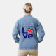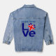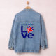 Personalised women's denim jacket with blue letters reading LOVE with a heart shaped Union Flag or United Kingdom Flag for the "O". Lovely anytime, but especially on Valentine's Day. Great way to share you love of your culture, heritage and ancestry. Designed to help you share your love of all things British, whether it be a person, place or just the culture in general. The design invites you to honour your ancestry and heritage.