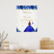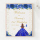 This elegant and glamourous birthday party welcome sign features a beautiful princess with brown red hair and fair skin in a royal blue ball gown. The text combines handwritten script and modern sans serif fonts for a classy and sophisticated look. The floral arrangements, butterflies and gold confetti create the perfect blend of rustic and chic.