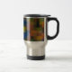 A cool Travel Mug, with an abstract chequered pattern in shades of dark blue, dark green and warm earth colours.
