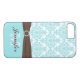 This modern, personalised, aqua blue and white damask iPhone 7 case with a chocolate brown PRINTED ribbon and jewel brooch has a spot for you to add your name and monogram.