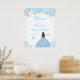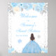 This elegant and glamourous winter sweet sixteen welcome sign features a beautiful princess with brunette hair and fair skin in a blue ball gown. The text combines handwritten script and modern sans serif fonts for a classy and sophisticated look. The floral arrangements, snowflakes and silver confetti create the perfect blend of rustic and chic.