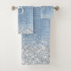 Easily personalise this trendy chic bath towel set design featuring pretty silver sparkling glitter on a blue brushed metallic background.