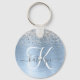 Easily personalise this trendy chic keychain design featuring pretty silver sparkling glitter on a blue brushed metallic background.