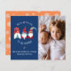 “We’re gnome for the holidays.” Three Scandinavian designed, cute, funny, whimsical gnomes in red and dusty blue and playful brick red typography on a navy blue background, along with the photo of your choice, help you usher in the Christmas, Hanukkah & New Year holidays. An ice blue and white snowflake random pattern on a orange coral background adorns the back. Feel the warmth and joy of the holiday season whenever you send this fun, simple, modern, personalised photo Christmas budget greeting card. Matching envelopes, stickers, tote bags, wrapping paper, serving trays, home décor, and more are also available. Send this to someone special!