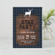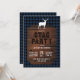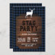 Rustic stag party invitation with the white silhouette of a stag, blue buffalo check, and wood grain. Blue buffalo check stag party invitation with cool fonts and printed wood grain. Wood grain stag party invite with a white deer and a blue and black plaid background.