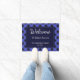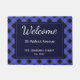 A stylish and eye-catching doormat with a blue buffalo plaid design. The buffalo check pattern forms an attractive surround to the central section, which is dark blue with white text. The wording begins with 'Welcome' at the top in script typography. Below this, the mat can be personalised with your address, name(s), and date 'established' at this residence. An ideal housewarming gift and a charmingly warm welcome for your guests.